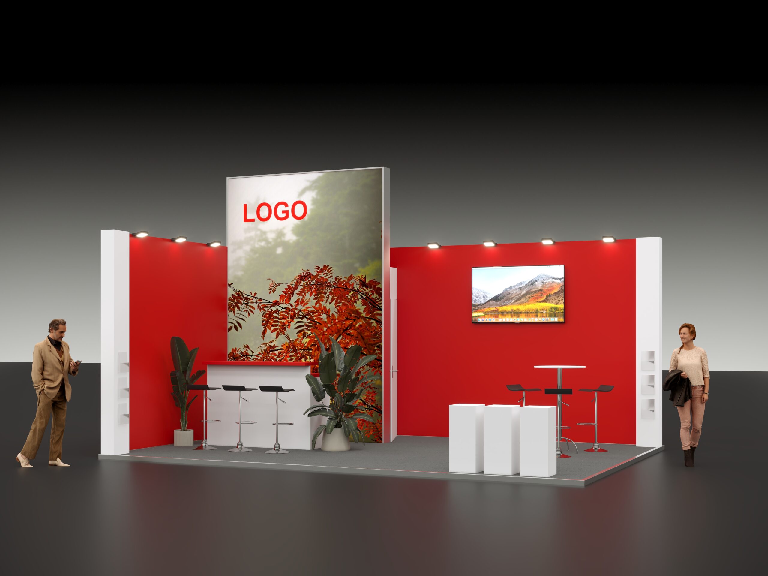 Grafisch wird der Stand durch eine Firmenlogo-Beklebung aufgewertet, die für eine klare Markenpräsenz sorgt. Der Messestand PREMIUM Typ S24 bietet eine hochwertige, funktionale und stilvolle Lösung für Unternehmen, die auf Messen einen bleibenden Eindruck hinterlassen möchten.