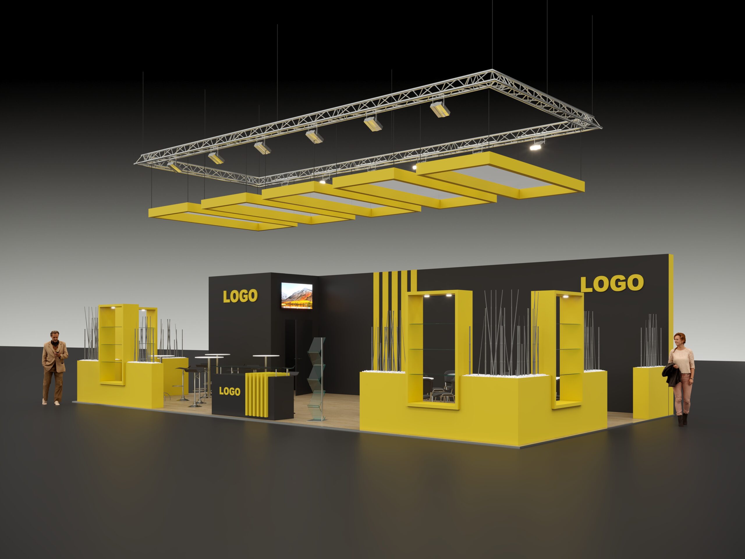 Auf der großzügigen Standfläche finden bequeme Sitzgelegenheiten, mehrere Hochvitrinen und Podeste sowie eine Infotheke Platz. Die Wände und Regale sind mit einer massiven Verkleidung in einer Farbe Ihrer Wahl versehen. Ein besonderes Highlight ist die beleuchtete Deckenkonstruktion.